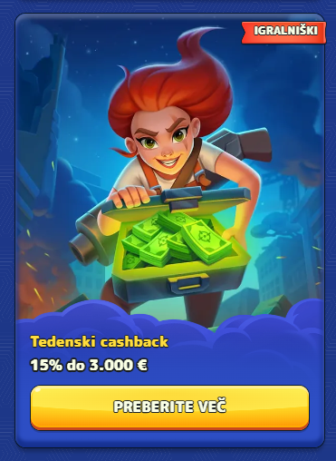 Tedenski in Live cashback imata wagering 1×. Tedenski (VIP) se knjiži ob ponedeljkih; Live cashback potrdi podpora.