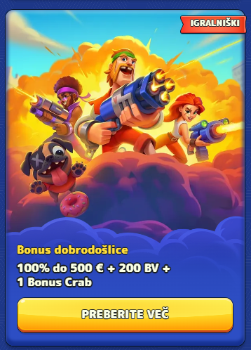 - Min. polog: 20 € za 100 % + 200 BV (ob min. 10 € dobiš 1 brezplačni “Bonus Crab” poskus).